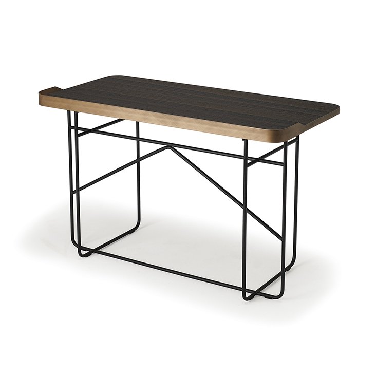Письменный стол с базой и рамой топа в стали, окрашенной в гофрированный титан (GFM11) или черный (GFM73), с базой из стали окрашенной в гофрированный черный (GFM73) и рамой топа в брашированной бронзе. Топ из ореха Canaletto (NC) или обоженного дуба (RB).