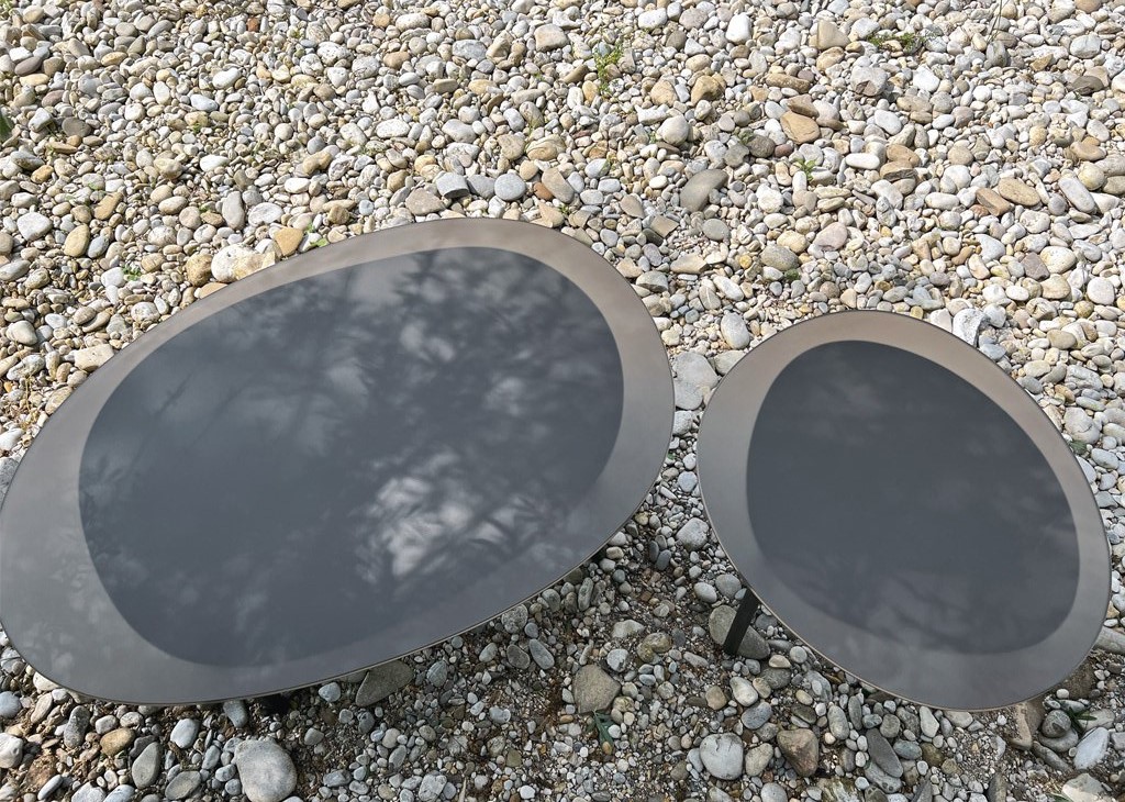 Особенностью TSUKI является свободная и органичная форма, обеспечиваемая полупрозрачным эффектом столешницы из матового стекла, просвечивающего неправильную форму базовой металлической конструкции, с созданием деликатной игры света и тени, напоминающей лунные фазы.