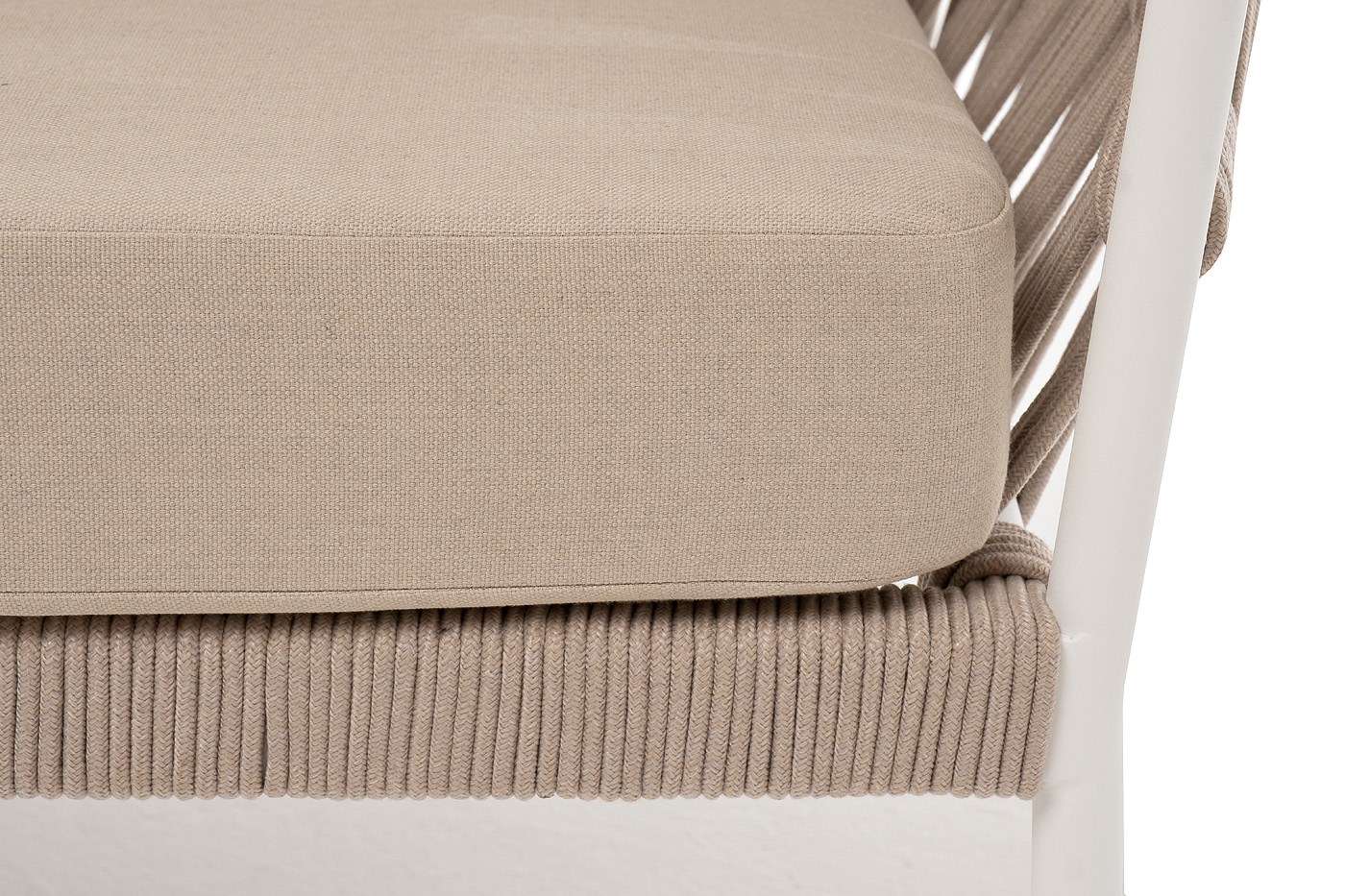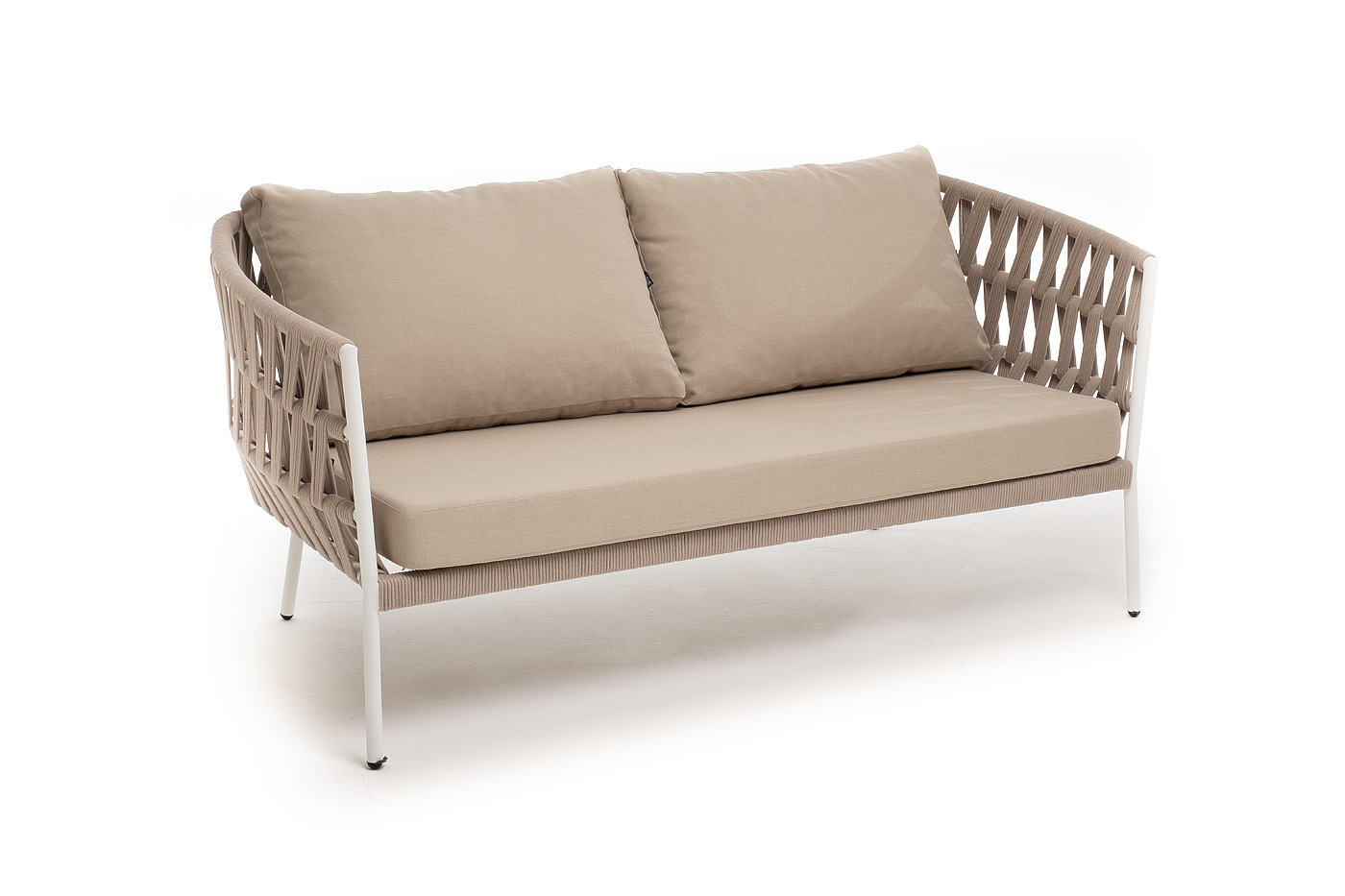 "Диего" диван 2-местный плетеный из роупа, каркас алюминий белый муар, роуп бежевый круглый, ткань бежевая 035