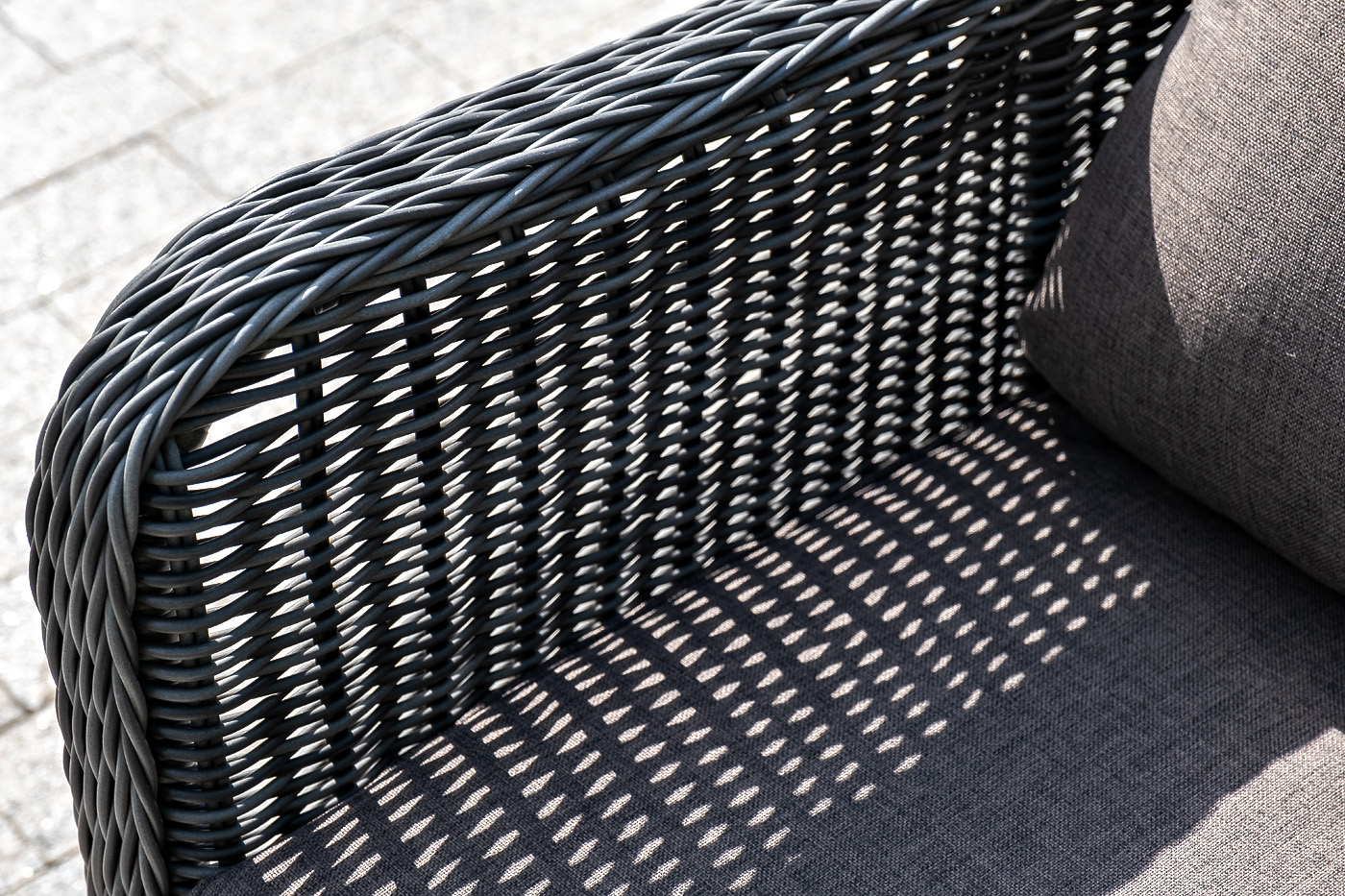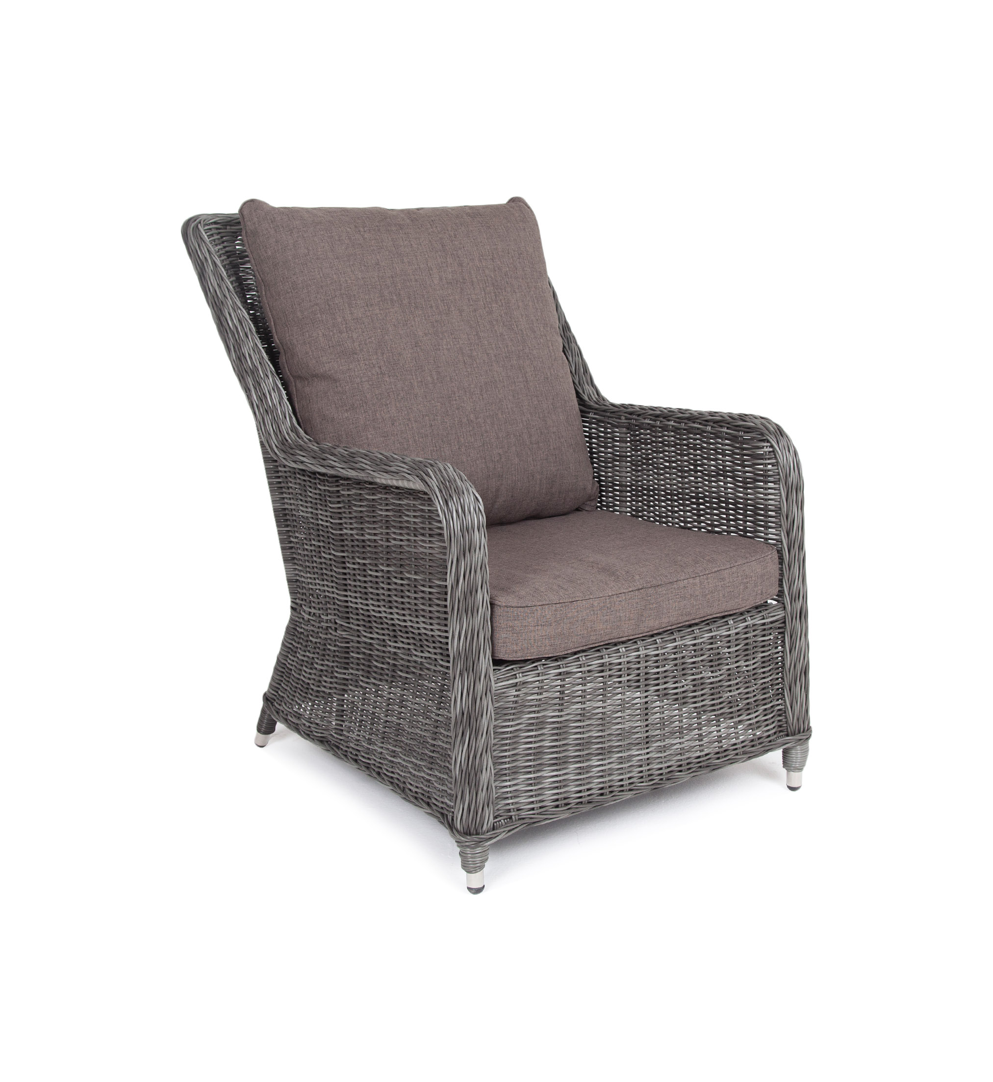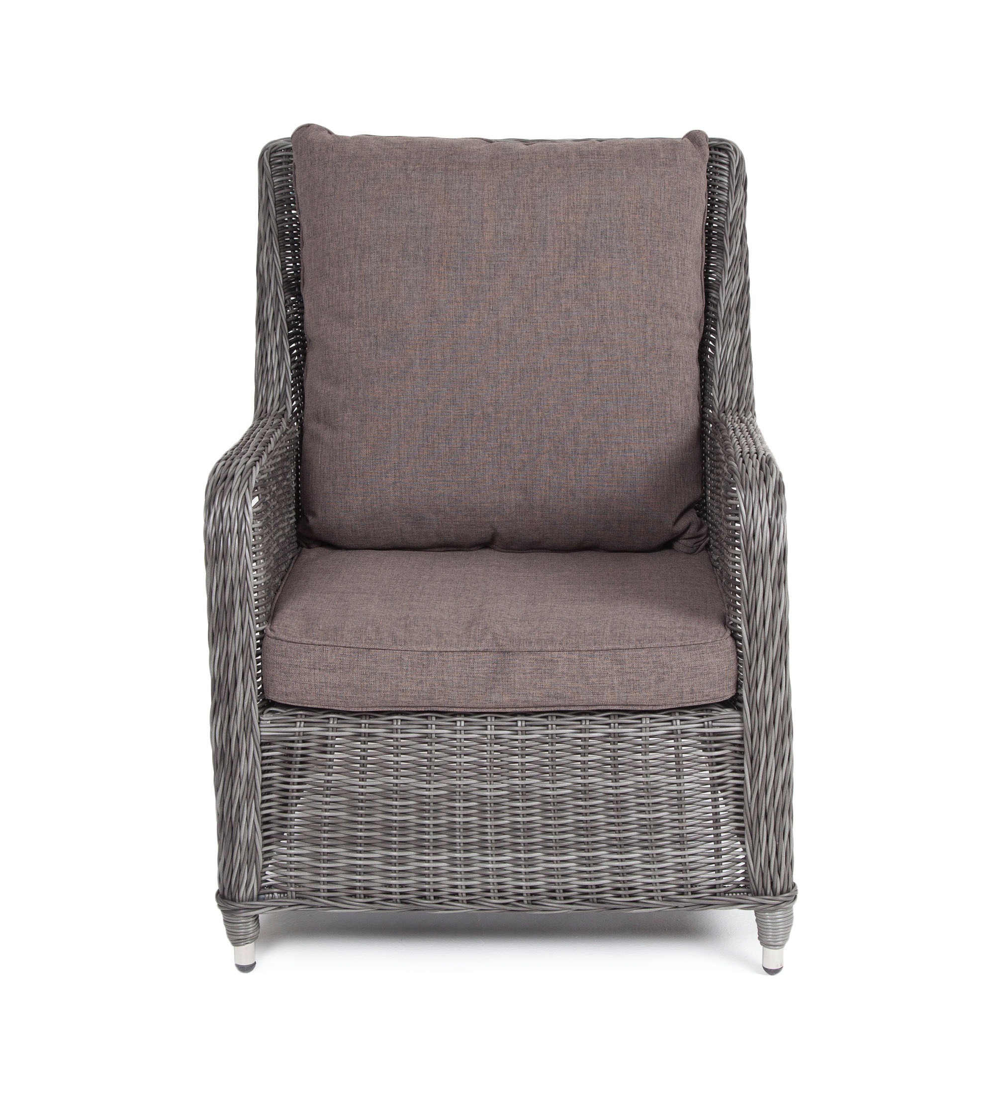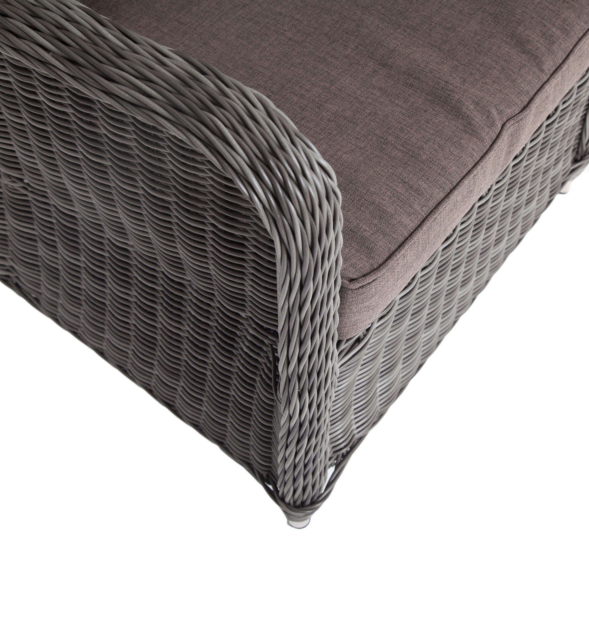 Кресло оснащено каркасом из прочного алюминия, а его оплетка выполнена из круглого ротанга ручного плетения графитового цвета.