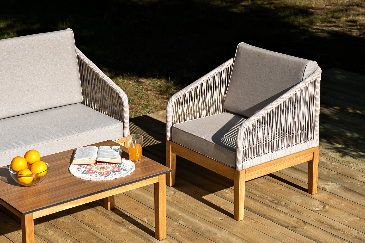 Каркас уличной мебели выполнен из дуба. Его дополняет бежевая оплетка, изготовленная на основе эластичных синтетических лент из полиэфирных волокон высокой прочности.