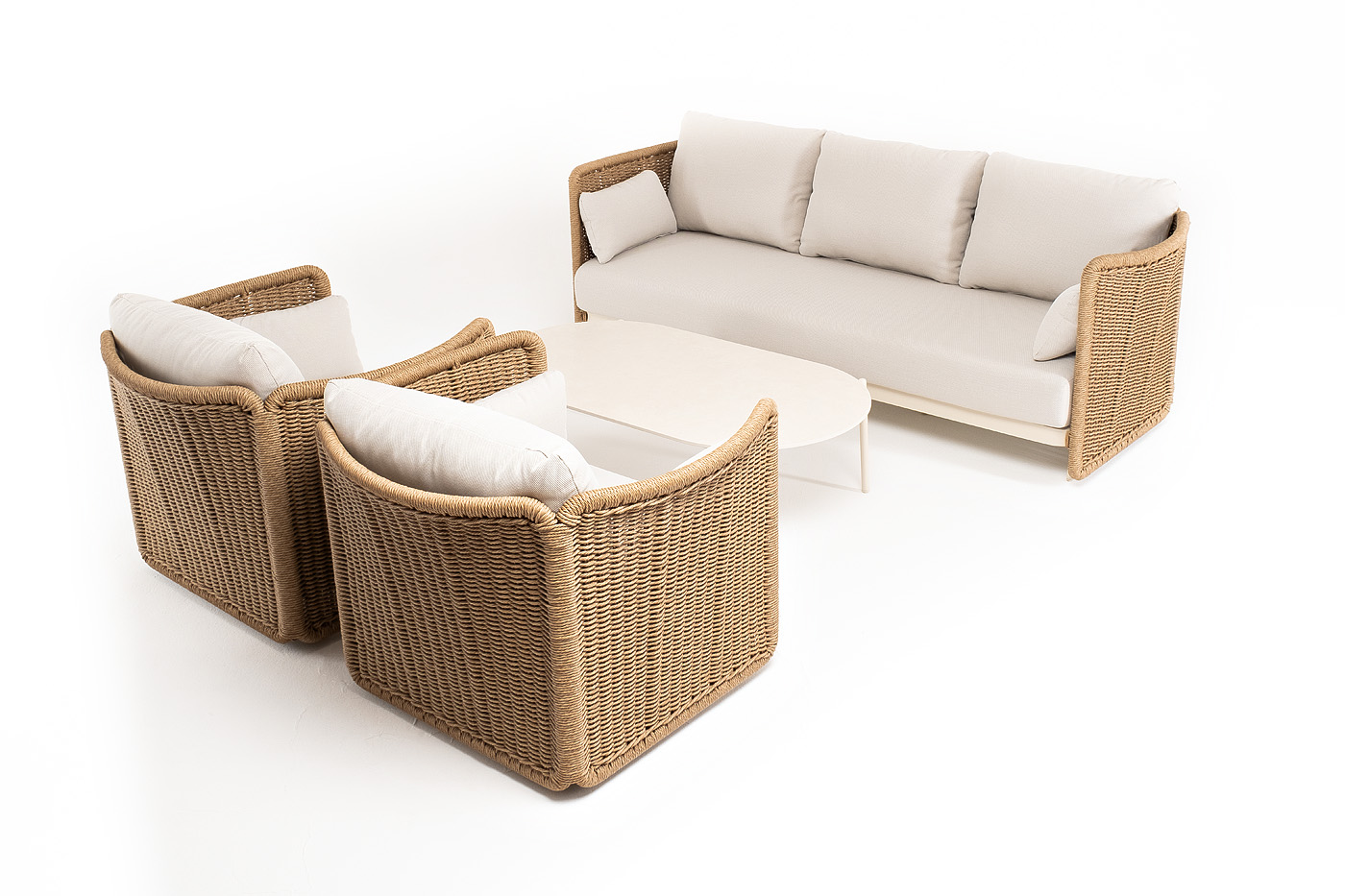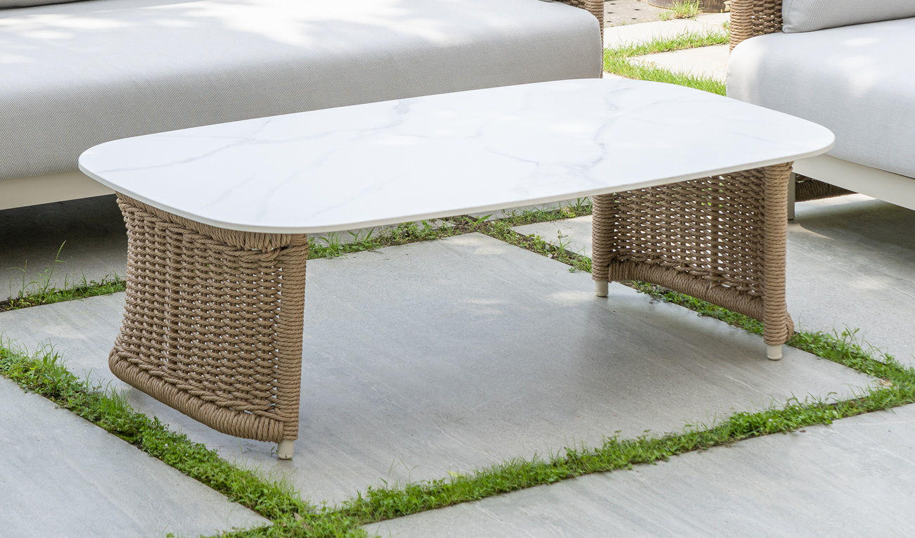 Журнальный столик выполнен из алюминия, окрашенного износостойкой краской, а его оплетка выполнена из круглого искусственного ротанга ручного плетения - 7 мм соломенного цвета. Столешница - овальная, выполнена из искусственного камня белового цвета.