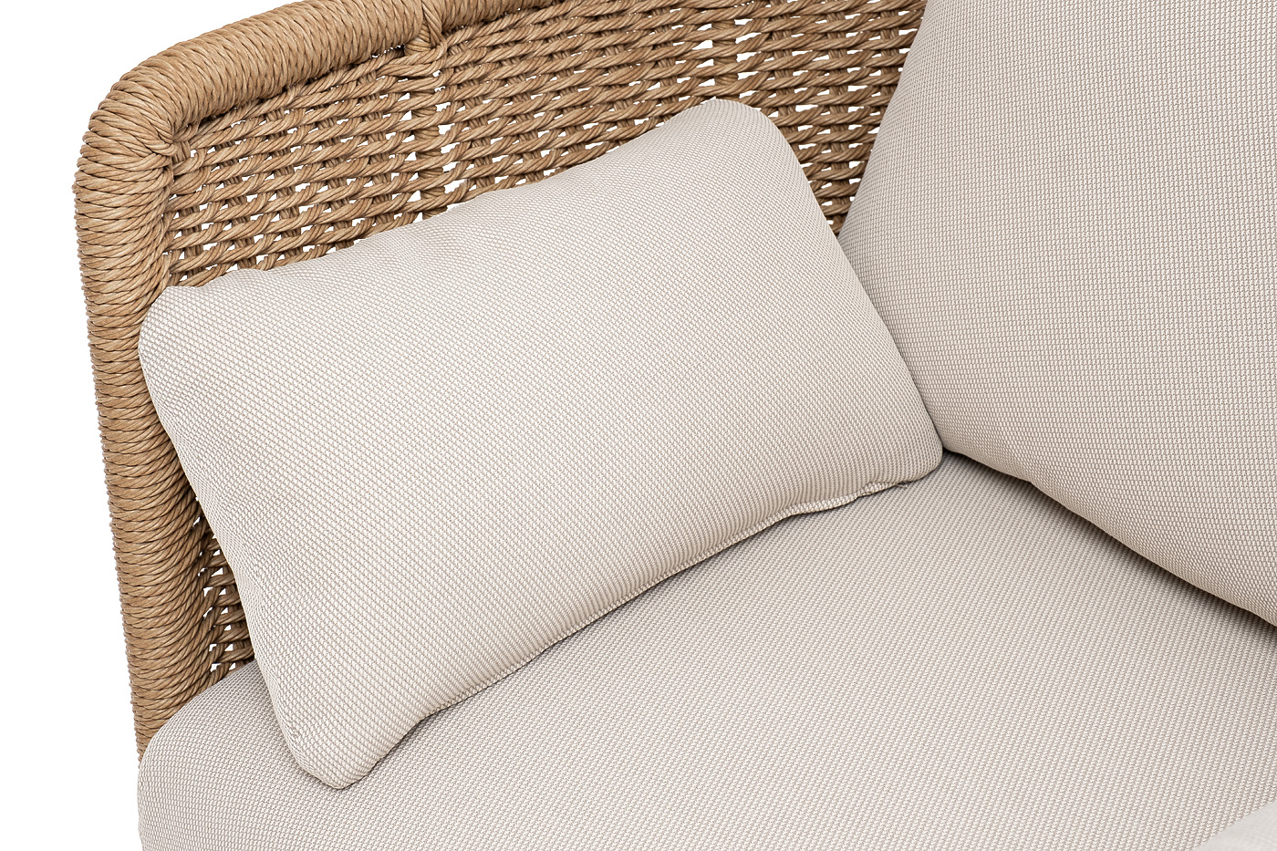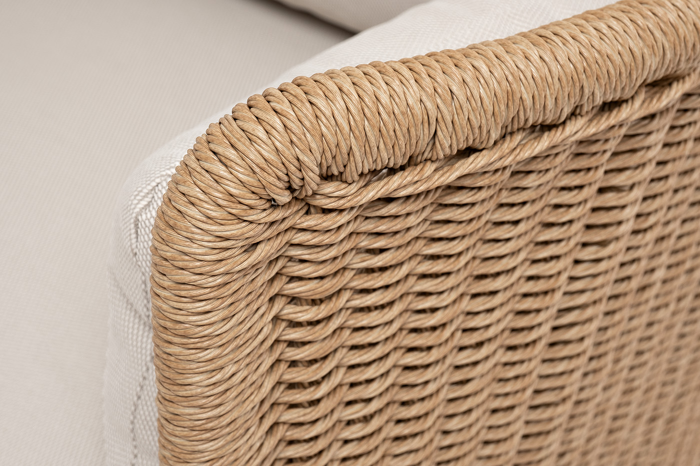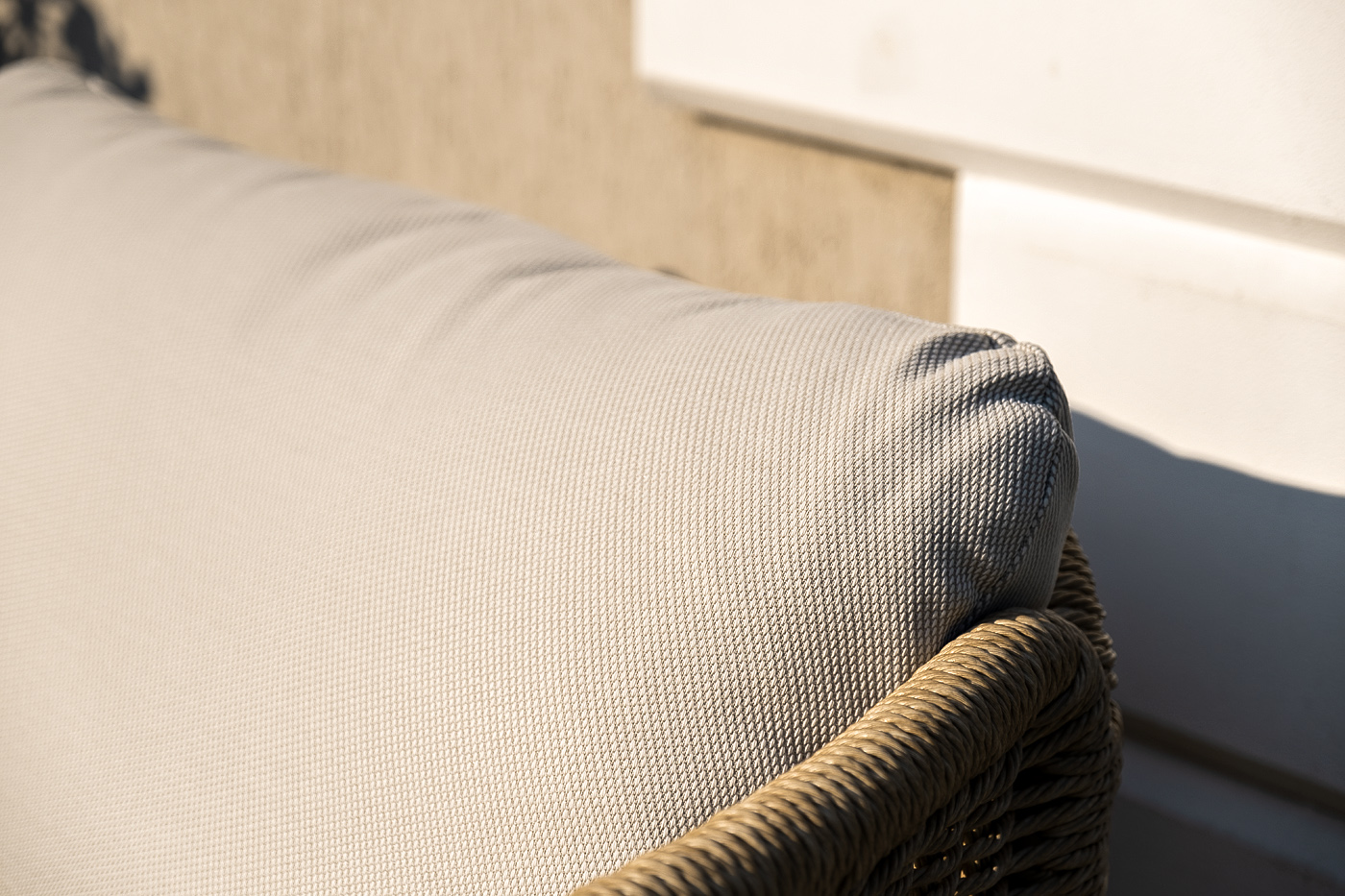 Плетеная мебель дополнена удобными подушками в бежевых чехлах. При их изготовлении используют полиэстер, плотность – 300гр/м2. Он обрабатывается влагоотталкивающей пропиткой для повышения защитных свойств материала.