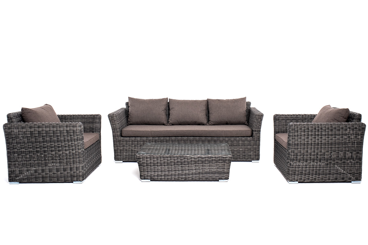 Кресла и диван идут в комплекте с подушками с серо-коричневыми чехлами. Они пошиты из качественного полиэстера с плотностью 230гр/м2. Материал предварительно проходит обработку влагоотталкивающей пропиткой. Столик дополнен практичной столешницей из стекла толщиной 5 мм.