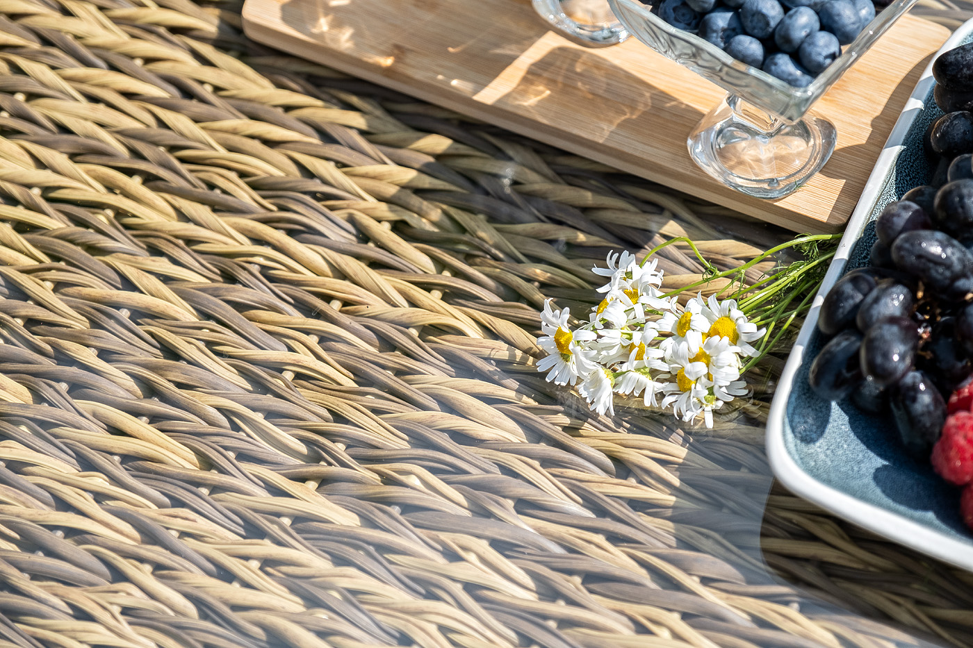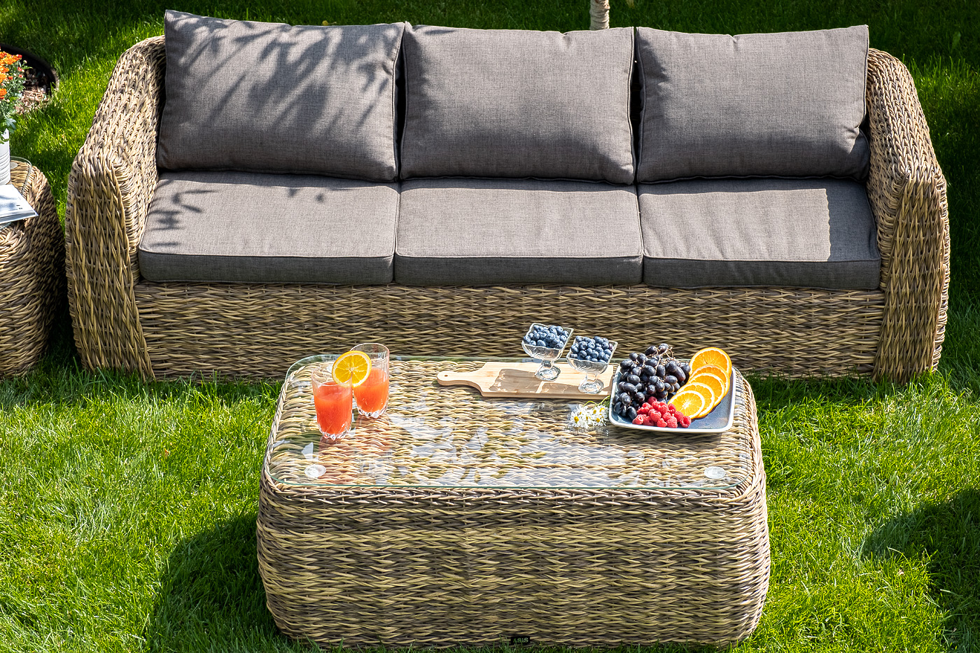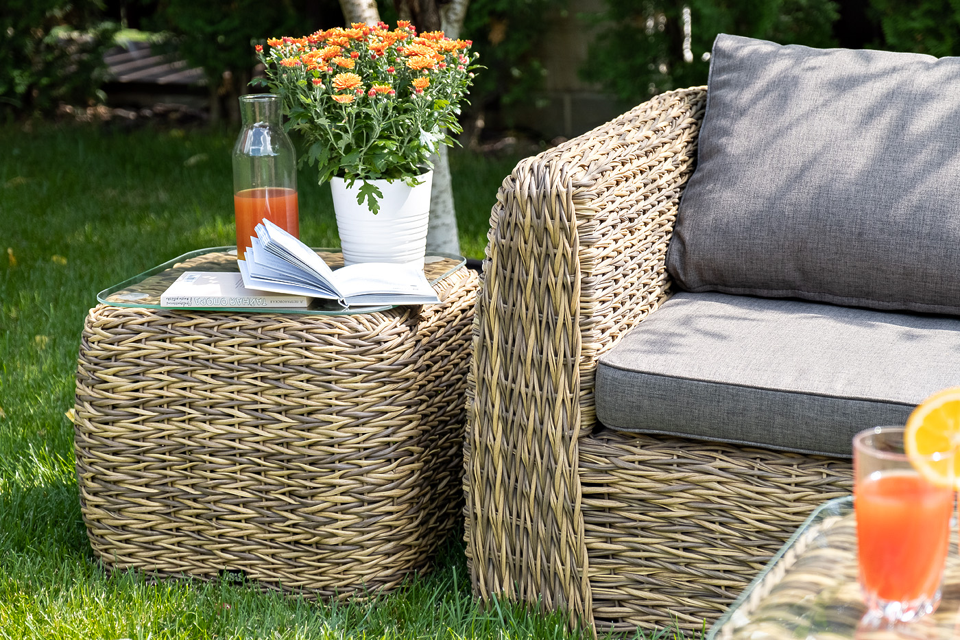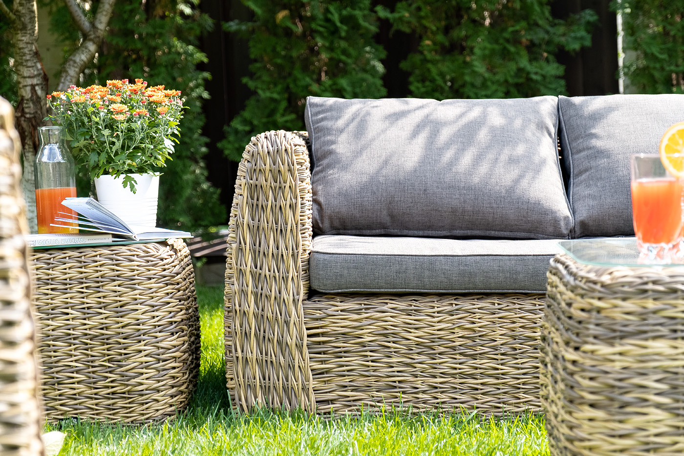 Комплект мебели представлен в соломенном цвете с плетением вида "гиацинт".