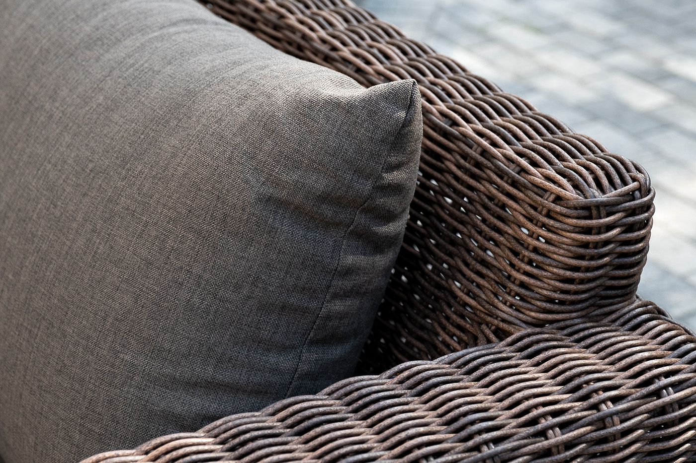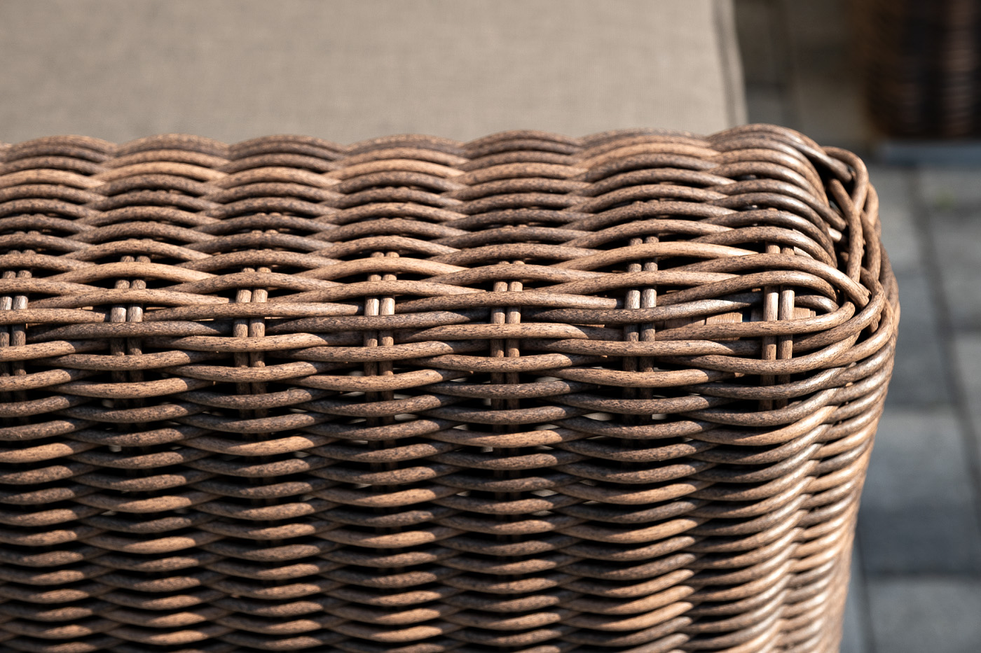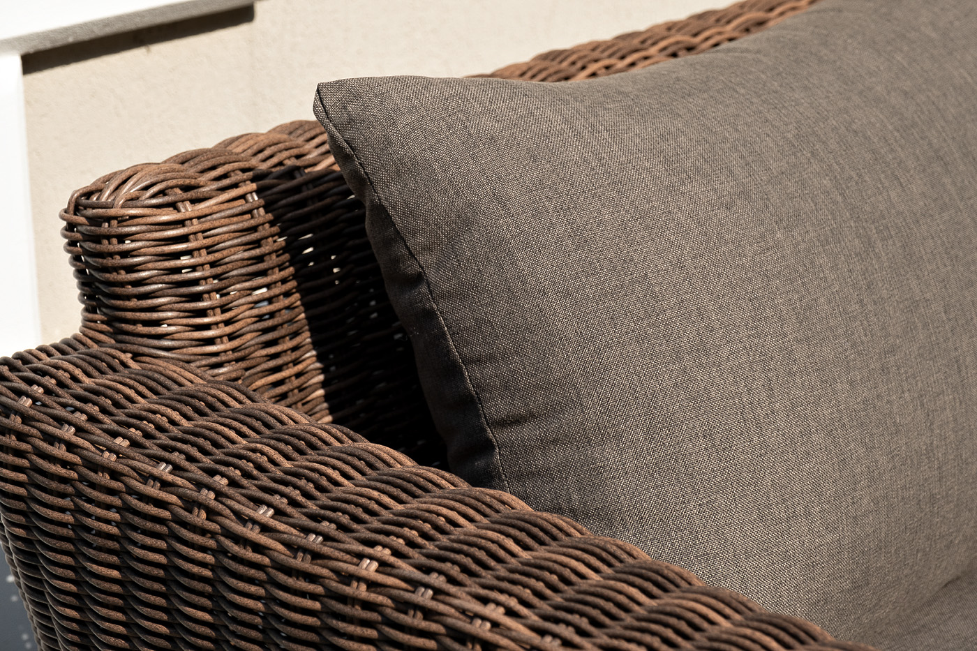 В качестве основы применяется алюминиевый каркас. Из круглого искусственного ротанга сделана ручная оплетка. Цвет комплекта – коричневый.