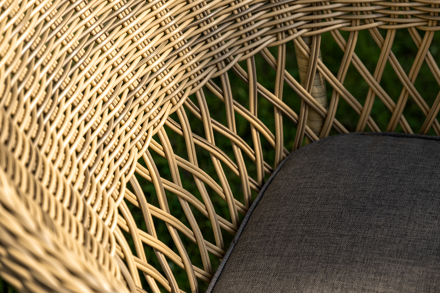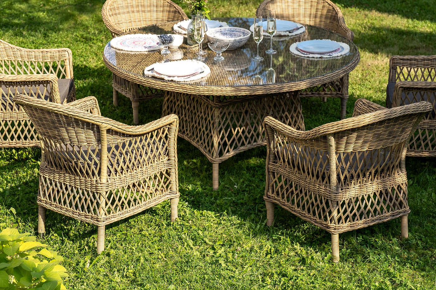 Вся мебель изготовлена из долговечного и легкого алюминия, обтянутого синтетическим ротангом. На столе для удобства эксплуатации предусмотрена столешница из ударопрочного закаленного стекла 5 мм. Стулья укомплектованы подушками на сидениях.