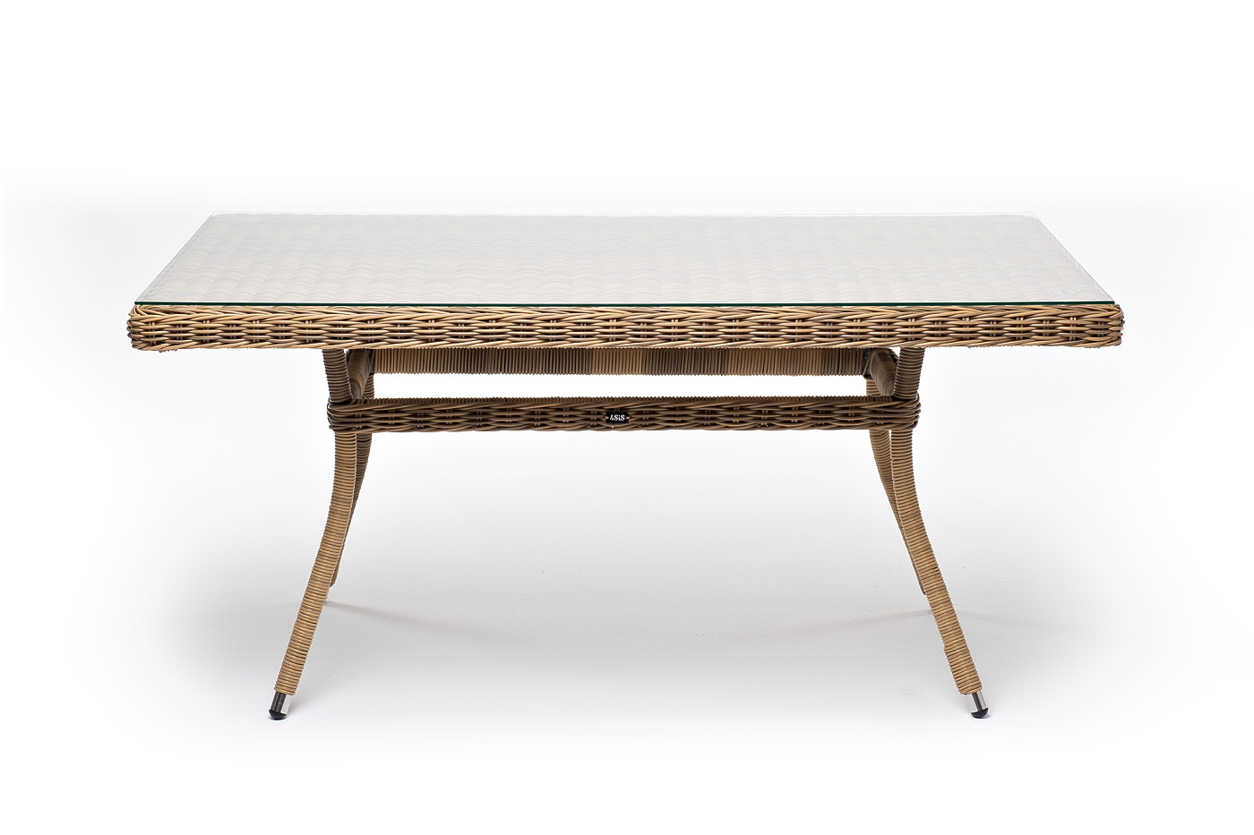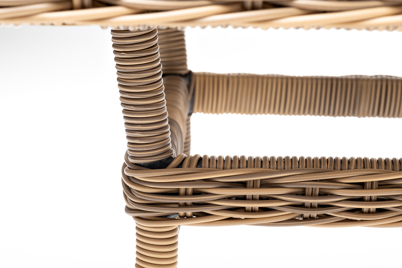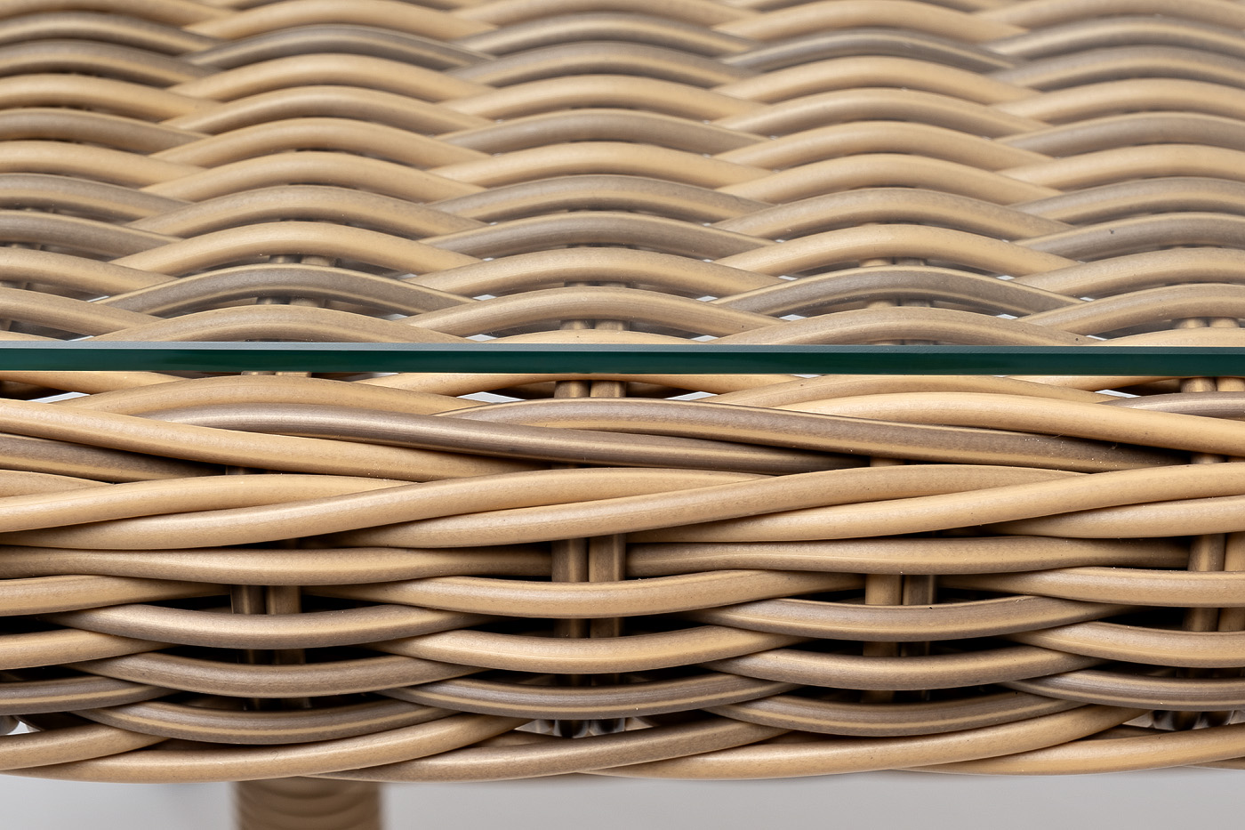 Каркас произведен из прочного алюминия, оплетка которого, выполнена вручную ротангом соломенного цвета. Поверхность защищает стеклянная столешница, толщиной 5 мм.